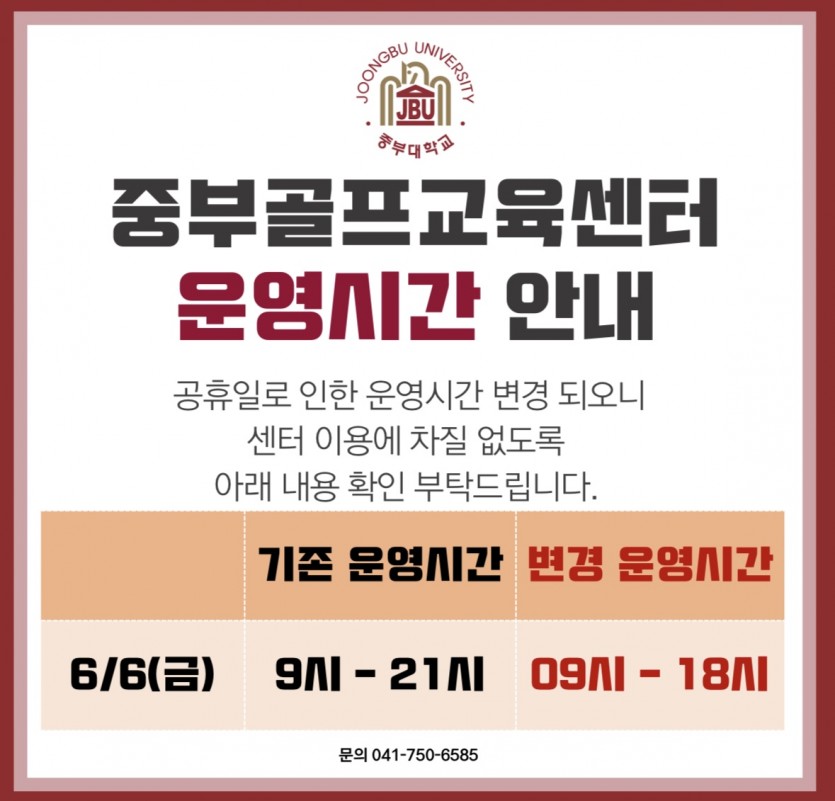 본문 6/6(금) 운영안내 안녕하세요. 중부골프교육센터입니다. 6/6(금) 공휴일로 인한 운영시간이 변경되어 안내 드립니다. 이용에 차질 없도록 아래 내용 확인부탁드립니다. ▶ 운영 시간 안내 날짜 : 6/6(금) 운영 시간 : 9시 - 18시 문의 041-750-6585