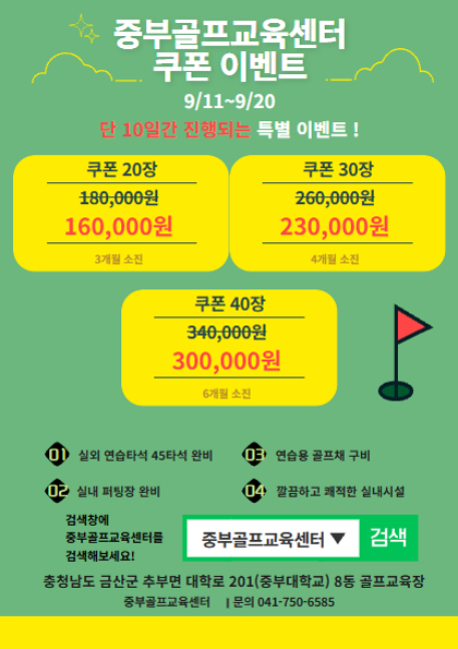 본문 안녕하세요, 중부골프교육센터입니다. 회원님들의 성원에 보답하고자 10일간 한정 쿠폰 할인 이벤트를 진행합니다! ※이벤트 기간: 9월 11일(목) ~ 9월 20일(토), 총 10일간 ※이벤트 혜택: 중부골프교육센터 일일 이용권 할인 쿠폰 증정 선착순 한정 수량, 조기 소진 시 종료